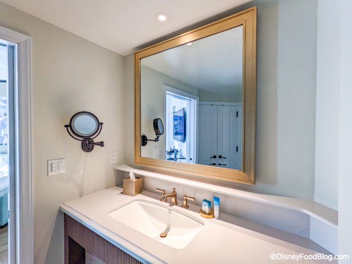 The bathroom in the Tower Studio is pretty large! It has a nice big mirror, plus a smaller mirror for makeup. There’s also a good amount of counter space.