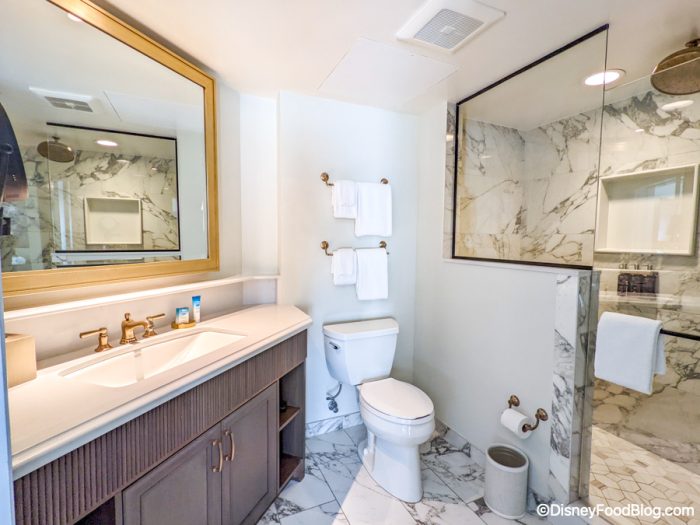 We need to talk about the SHOWER. It’s got a fancy rainfall showerhead, gorgeous tile, and PLENTY of space! Yeah, we could get used to this.