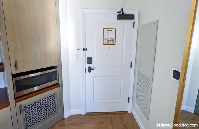 There are several types of rooms available at the Riviera. The Resort offers Deluxe Studios, One and Two-Bedroom Villas, Three-Bedroom Grand Villas, and a Tower Studio room. We’re taking a tour of a Tower Studio room that has one Queen-Size pull-down bed and sleeps up to two adults. OK, now, let’s head inside! Here’s a look at the front door. Now, this is a studio, so there isn’t going to be space for any “entryway” or hallway like you may see in other Disney World hotel rooms.