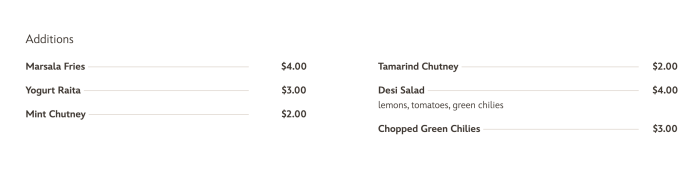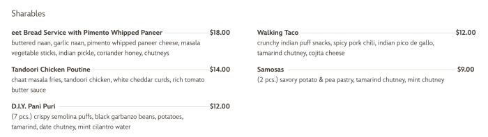 The menu has quite a few options, and they’ve got a little of something for every taste! In the Sharables section, you’ll find a bread service, a Tandoori Chicken Poutine (we were really excited about that!), D.I.Y. Pani Puri, a Walking Taco, and samosas.