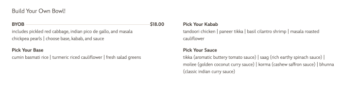 The build-your-own-bowl section is for those who like a bit of customization with their food. You get to choose your base, kebab, and sauce.