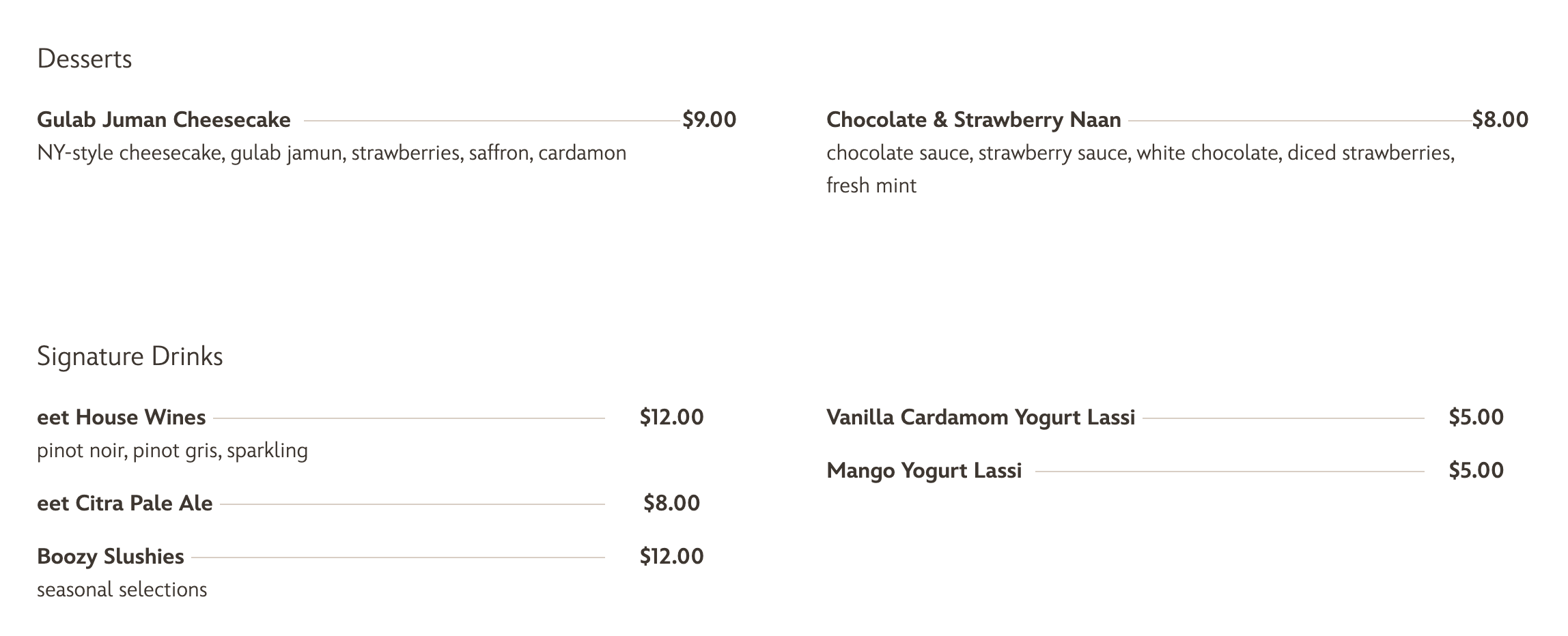 And of course, we have to mention dessert! They have a Gulab Juman Cheesecake and a Chocolate & Strawberry Naan.