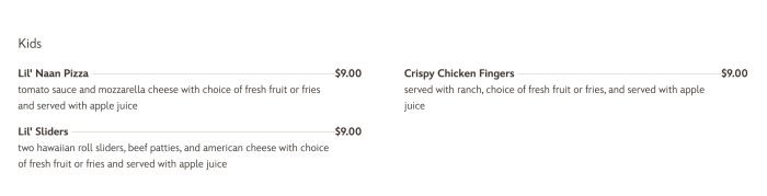 For the little ones, there’s Naan Pizza, Sliders, and Chicken Fingers.