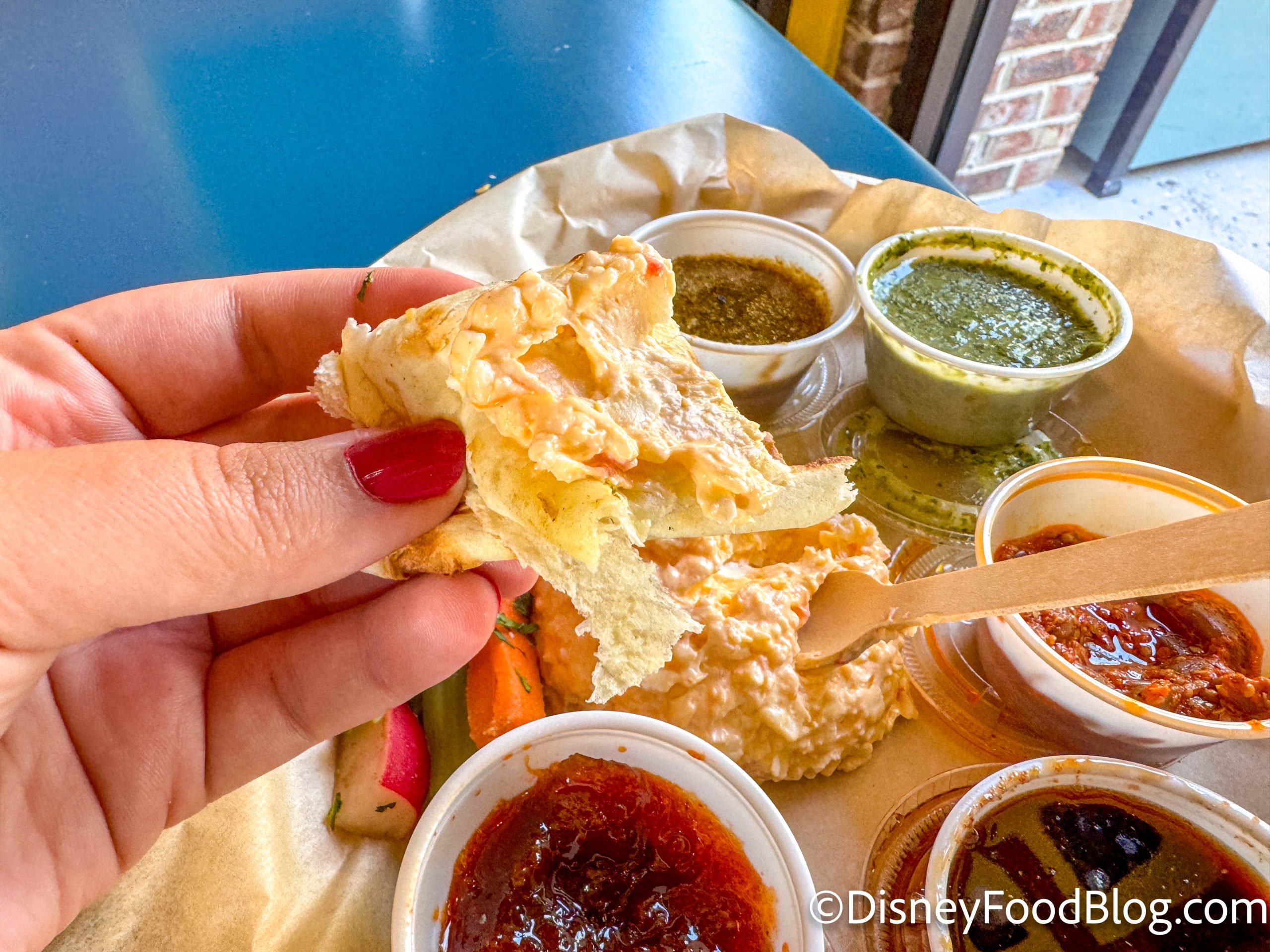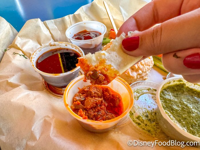 Let’s start out with the sharables. You know that we love a good bread service here at DFB, so when I saw the EET Bread Service with Pimento Whipped Paneer on the menu, I knew I’d have to try it! It comes with buttered naan, garlic naan, pimento whipped paneer cheese, masala vegetable sticks, Indian pickle, coriander honey, and various chutneys.