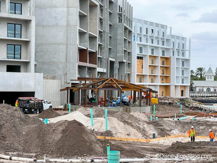 The gazebo-shaped building being constructed next to the main building could be something pretty exciting. While Disney hasn’t officially confirmed anything yet, a Polynesian Resort Cast Member told us that it is going to be a restaurant. As we said, Disney hasn’t publicly stated this news yet, so take that information with a grain of salt. But if it’s true, we will be SUPER excited! Oh, and there’s more. A Cast Member also said the space between the buildings would be a new pool! (Again, Disney has not officially confirmed anything yet; this is just what a Cast Member told us during our recent visit.)