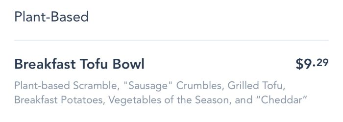 Contempo Cafe’s Breakfast Tofu Bowl is $9.29 and is a vegan-friendly option that consists of plant-based egg, plant-based sausage crumbles, shredded carrots, a few broccoli pieces, tater tots, and cubes of tofu.