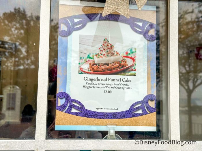 - Gingerbread Funnel Cake: Vanilla ice cream, gingerbread crumbs, whipped cream, and red and green sprinkles (New) — $12.00