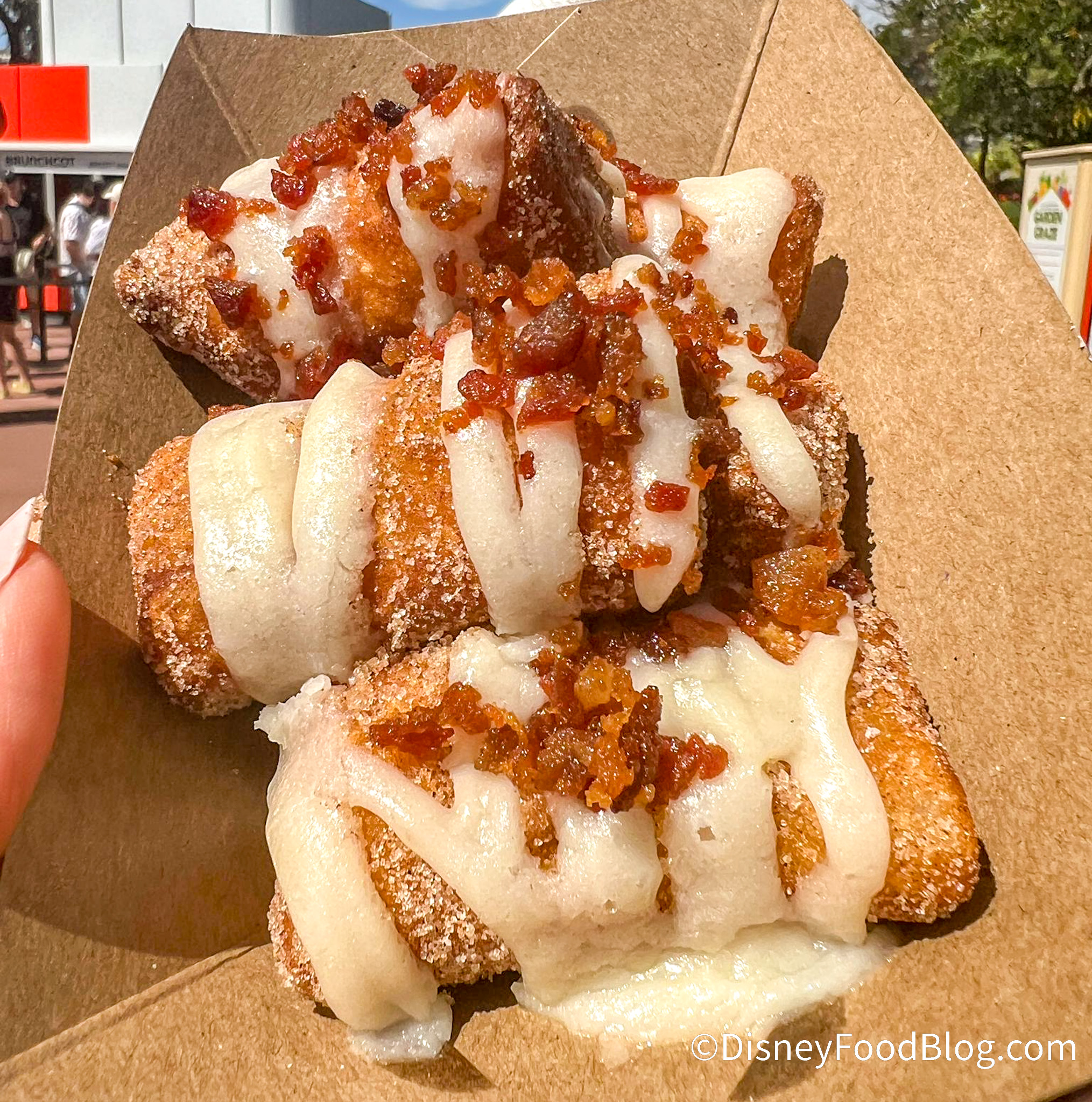 - Fried Cinnamon Roll Bites with cream cheese frosting and candied bacon — $5.00, DDP Snack Eligible