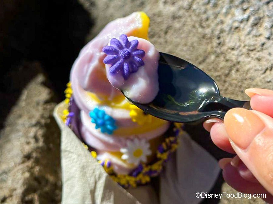 But we’re STILL not done. We’ve got one more Dole Whip treat to go. This one is the Rapunzel Cone, which we’ve had before, but it’s changed a little bit. Previously, it was made with Dole Whip Lemon and Dole Whip Raspberry swirled in a lavender cone, topped with sugar flowers. Now, it’s made with Dole Whip Lemon swirled with Cotton Candy Soft-serve in a Lavender Cone with Sugar Flowers.