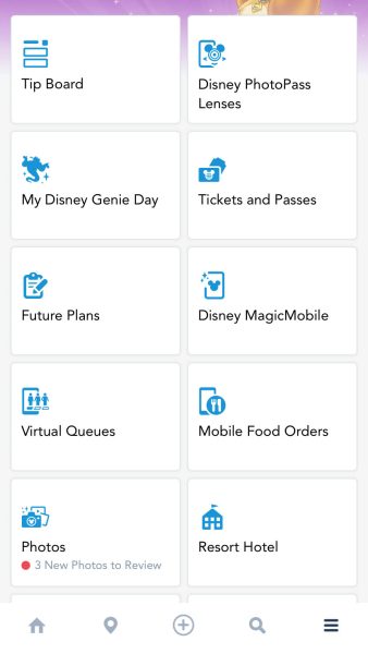To see your Disney Dining Plan, open the My Disney Experience app and click the three stacked horizontal lines in the bottom menu.