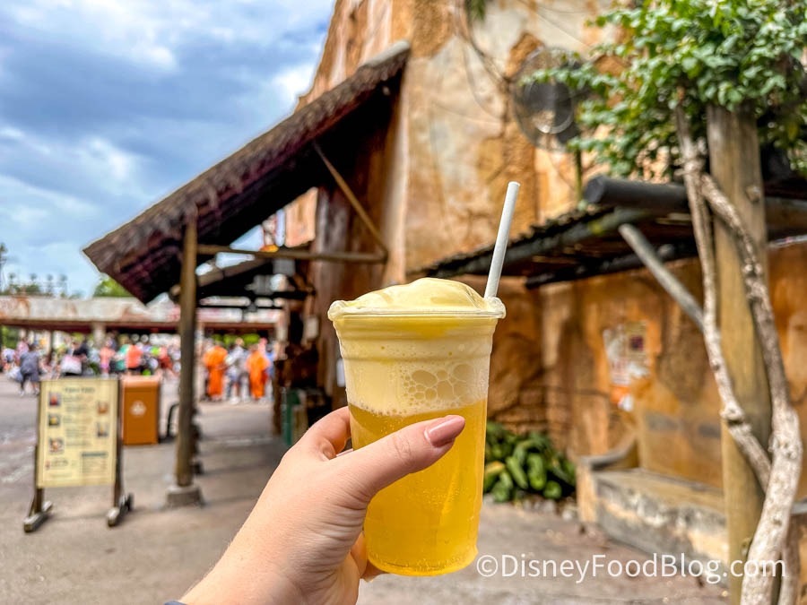 Over at Tamu Tamu Refreshments in Animal Kingdom, you can get boozy Dole Whips, and we were pretty thrilled when we found out that the Dole Whip Pineapple Hard Cider Float counts as a snack credit! It’s Dole Whip Pineapple served with ACE Pineapple Craft Cider. This a light and refreshing drink — also, we love how it foams up!