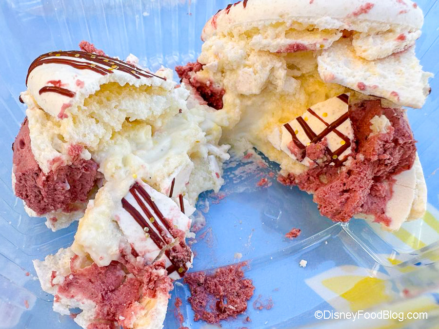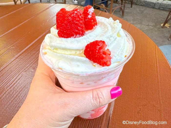 The raspberry shake part was delicious. We felt that cheesecake bites lacked flavor. All we got was something that tasted like plain old soggy cake. It might have made more sense to sprinkle them on top than have them at the bottom of the shake. By the time we got it, they were a mushy glob. We think Disney missed the mark on this one.