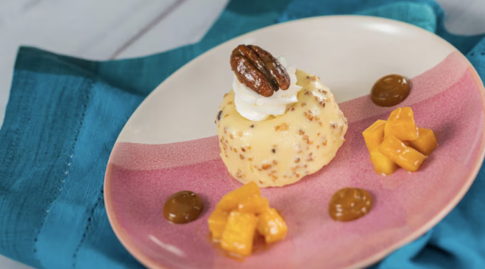 - Peach Cobbler: Cinnamon panna cotta, peach cobbler, brown sugar streusel, and whipped cream with a Tiana chocolate piece (New)