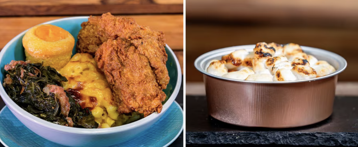 - Fried Chicken Bowl: Spicy honey-glazed fried chicken served with four cheese mac ‘n cheese, smoked turkey collard greens, and sweet potato corn bread