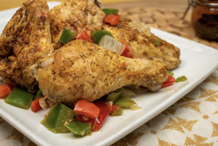 - Poulet Mariné Au Four (Baked Marinated Chicken): Baked chicken marinated in assorted spices served with red peppers, green peppers, and onions