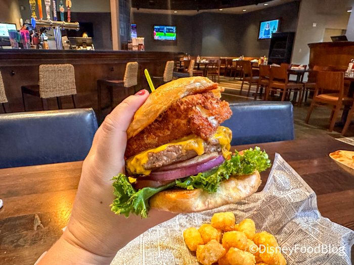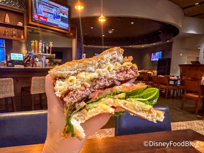 This burger is LOADED. It’s their signature burger topped with crispy and creamy macaroni and cheese, sharp cheddar, lettuce, tomato, and onion all on a toasted bun. This burger is HUGE (like, gives you carpel tunnel huge). It’s served with standard Disney tater tots (that we found to be very salty).