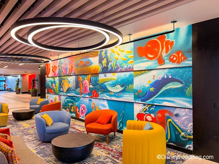 Disney has said that Pixar Place Hotel will “weave the artistry of Pixar into its comfortable, contemporary setting.” There’s a lot of decor and artwork in the lobby that features some of our favorite Pixar characters and movies.