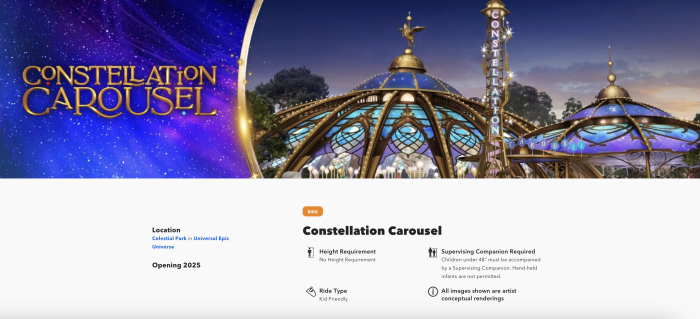 The rides that Universal confirmed are both coming to Celestial Park, which is the central hub of Epic Universe. There’s a roller coaster that’s themed to the cosmos and a beautiful carousel!
