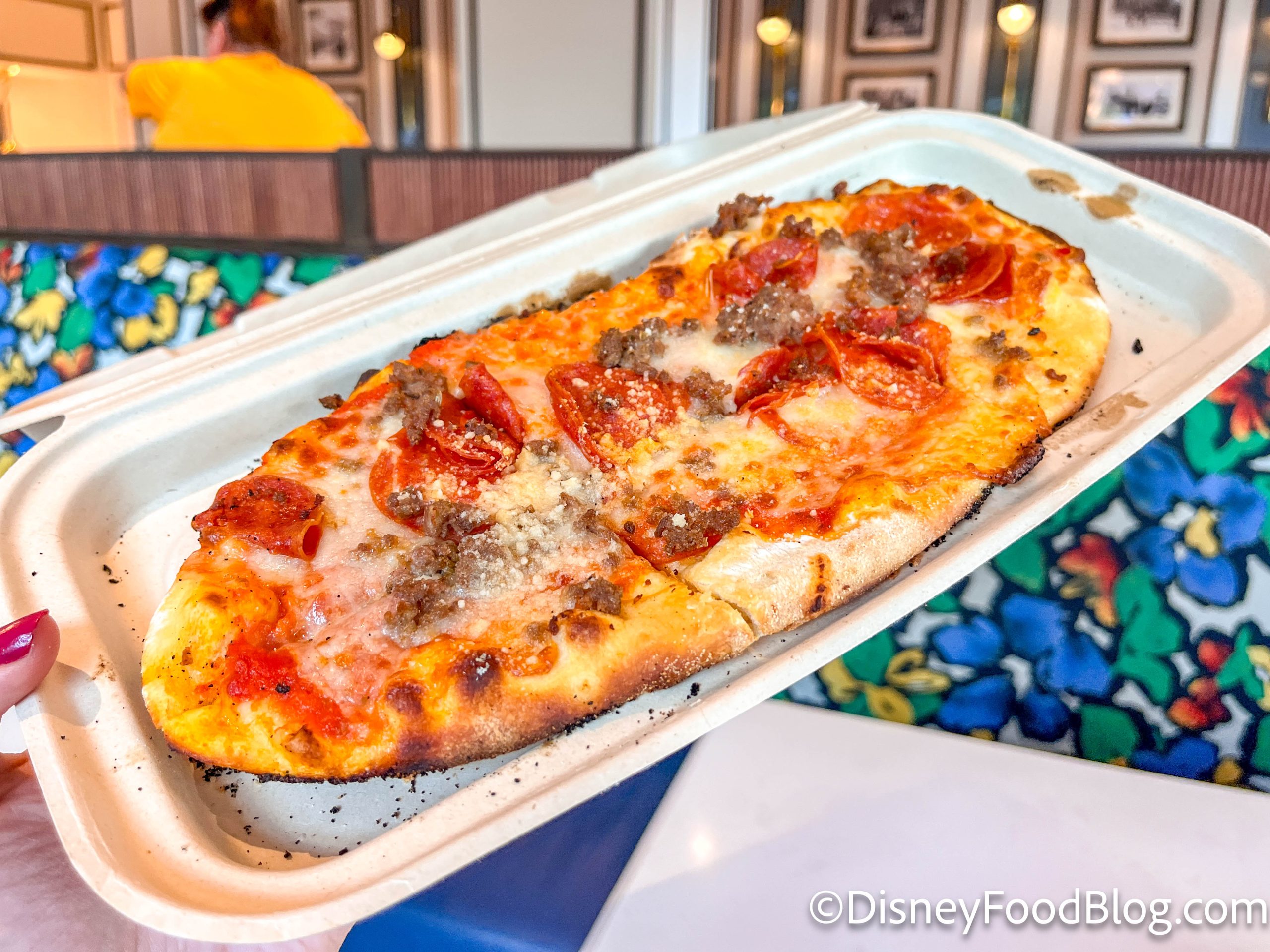 This was already a little bit cold when I got it, but I didn’t really mind because it’s one of the most delicious quick service pizzas I’ve eaten in Disney World! There’s a hint of spice in the sauce and the meats, and you get a generous portion of pepperoni, sausage, and parmesan.
