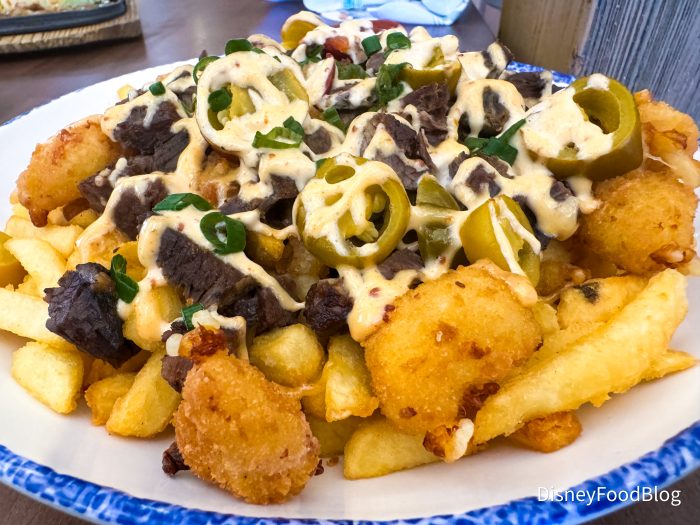 The fries were super crispy and crunchy — exactly what you want for a dish like this. They were topped with a whole mountain of things, so we knew that it was time to dig in.