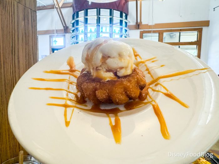 We were kind of obsessed with this. We love a fun take on a churro — especially at Disney. This was everything that you love about a churro, but in a donut form. It was very sweet and the ice cream added a great touch. There is chocolate and caramel sauce hidden underneath the donut, so make sure you don’t miss it when you’re eating it. The sauces provided a great source of flavor and we really enjoyed it — especially the caramel.