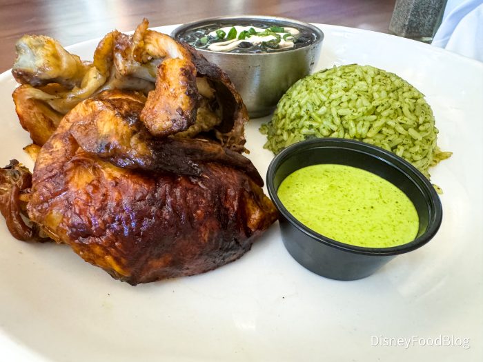 Now, it is time for the main course! We got the Peruvian A La Brasa Rotisserie Half Chicken, which came with half chicken, cilantro rice, and black beans with lime crema. It is on the menu for $29.