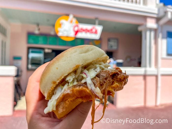 We stopped by Good’s Food to Go at Disney’s Old Key West Resort to check out a couple of things they had on the menu — the Tuna Salad Sandwich, Kettle Chip Loaded Nachos, Mango Rum-barbecued Pulled Pork Sandwich, and the Key Lime Swirl!
