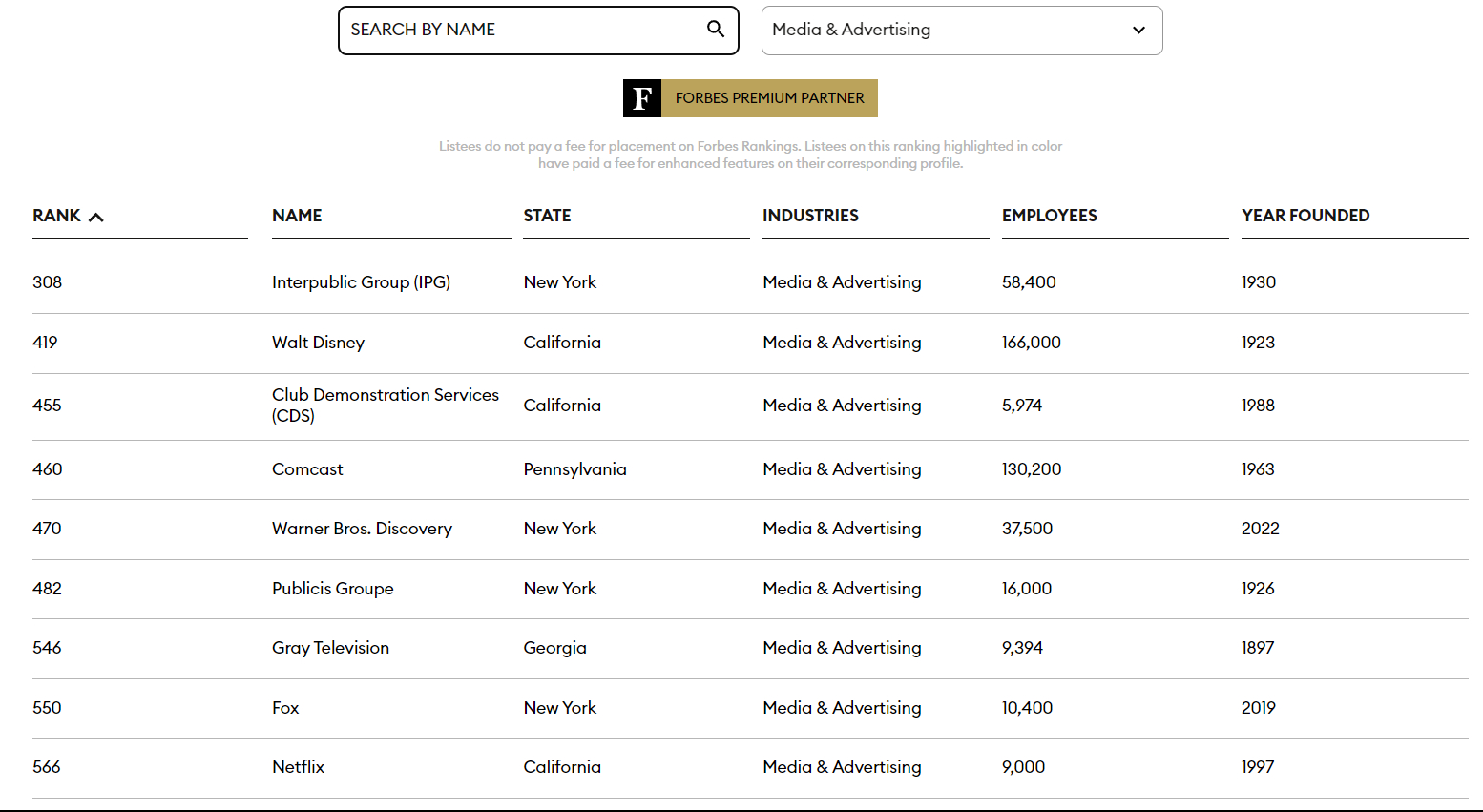 However, the company came in second within its industry, Media and Advertising, just below Interpublic Group. It ranked higher than Comcast, Warner Bros. Discovery, and Netflix.
