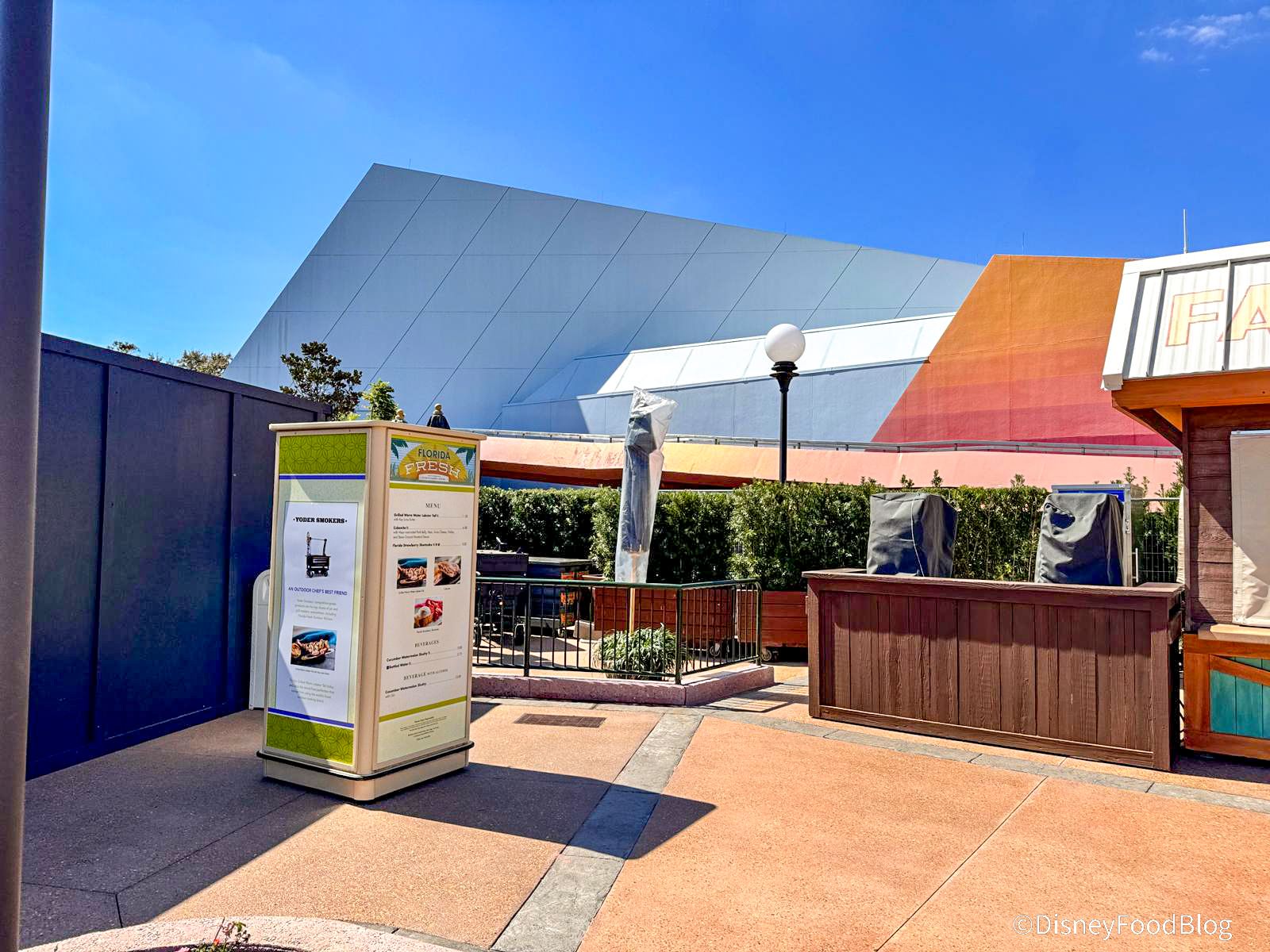 The area was stanchioned off today, so this was as close as we could get. However, we will be back tomorrow for the OPENING of the EPCOT International Flower & Garden Festival and get you REAL close! The booth is looking FRESH and ready to serve guests tomorrow!