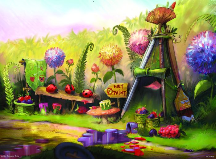 and its changing seasons. Once aboard you’re shrunk to fairy size! Everything from flowers and mushrooms to painting utensils and even pieces of nibbled cheese will be so much larger in size than you’re used to. The attraction’s boarding area is a delivery service location where you’ll board the Busy Buggy and help Tinker Bell deliver items to those waiting for them.