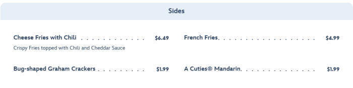 - You want more healthy options to choose from. We really enjoyed the Cobb Salad here, and you can sub your French fries for a mandarin orange, but there aren’t many other healthy options here. We would recommend Satu’li Canteen, Yak and Yeti or Tiffins for menus with less fried foods!