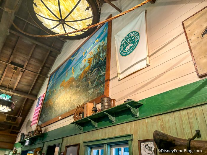 The coolest thing about this restaurant is The building, a mashup of a National Park Lodge, a Ranger outpost, A garage in a Quonset hut and an Airstream trailer turned diner. All tied together with a fantastic backstory presented in letters, signs, memos, graffiti and memorabilia throughout the facility. Some of the finest props and art on display anywhere in Disney, including fossil replicas, rare (and expensive) hand-screened band posters, imagineering art (like the greasy handprints in the Quonset illustrating Dinos) and a boatload of “O’Saurus” visual jokes. Look for the Joe Rodhe signed illustrations on the wall by the exit in the main dining room.