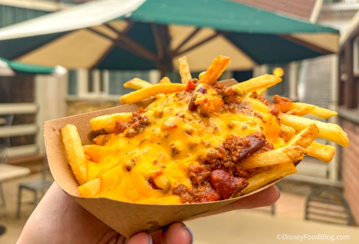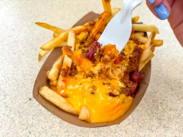 We already fell in love when we saw that these fries have Disney’s plastic cheese on them! The chili was also really tasty, though. It had a lot of flavor and even a slight kick to it. The chili had lots of meat in it and paired really nicely with the cheese sauce. Overall, these fries are a decent-sized snack option, and it is hard to go wrong with the combination of chili and cheese.