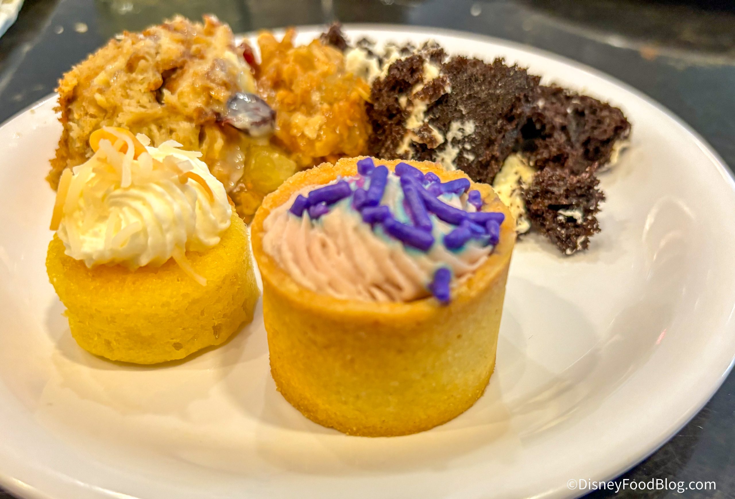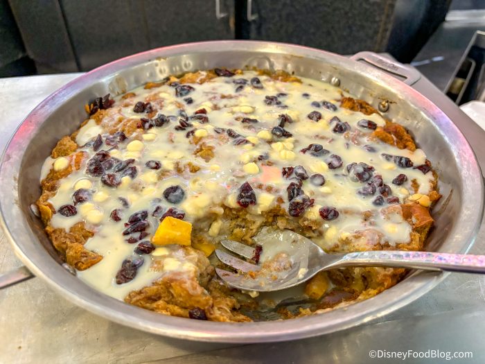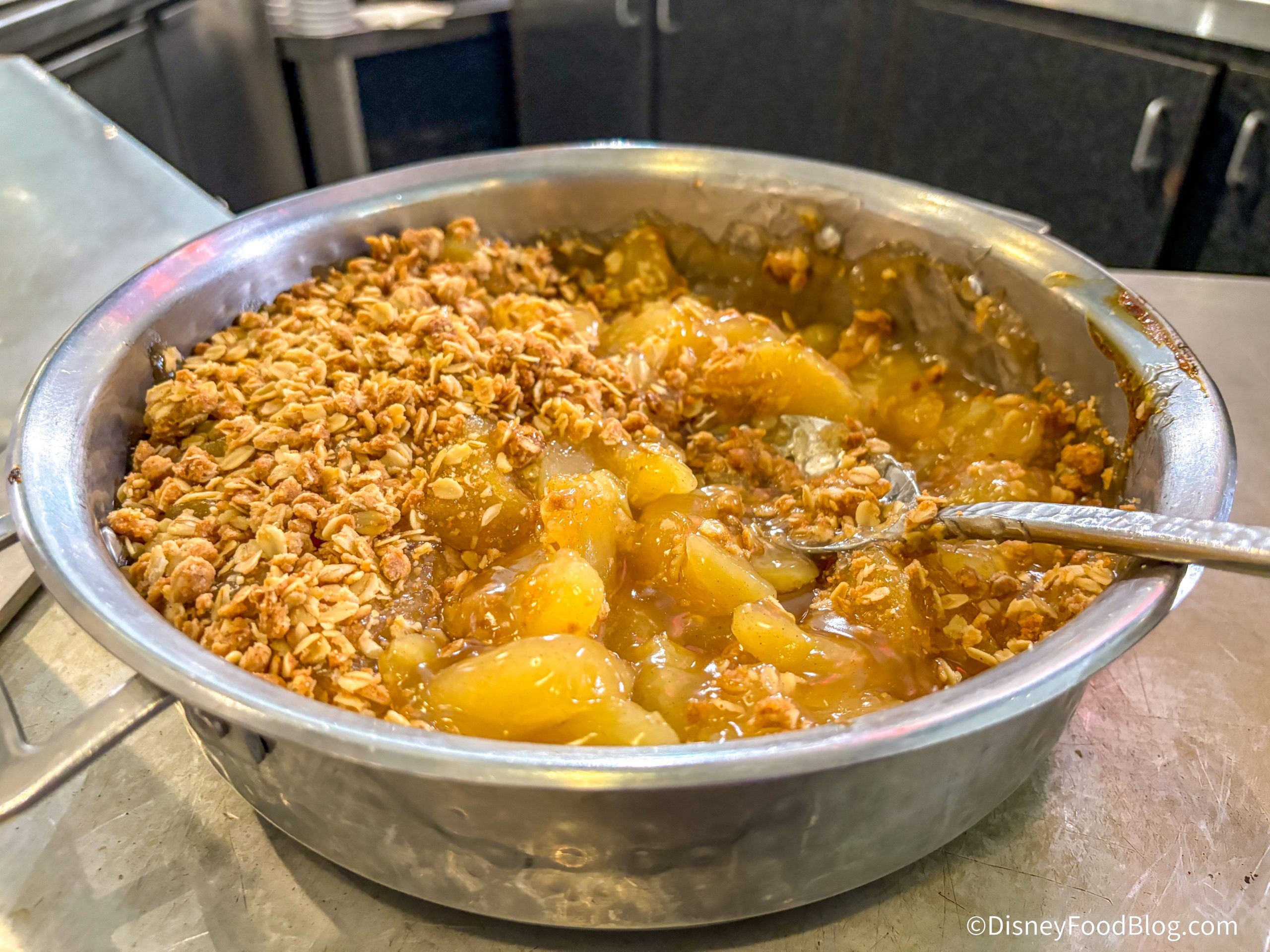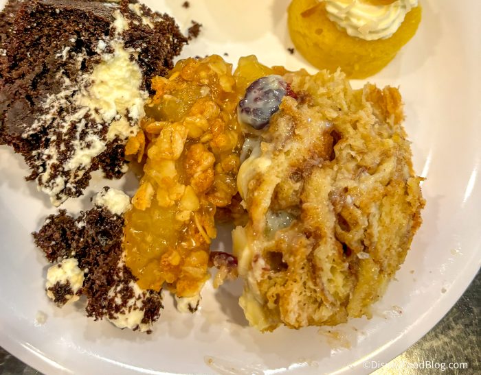 We also grabbed some samples of the Apple Crisp and Bread Pudding. The Apple Crisp is exactly what you would expect. It had soft, tender apples with a sweet, syrupy glaze and was topped with a crunchy, sweet oat topping. We think the Apple Crisp would be fabulous alongside some vanilla ice cream. The Bread Pudding was a bit disappointing. The combination of raisins and white chocolate actually worked really well, but the bread pudding was really dense and kind of hard to eat. The vanilla sauce on top helped a bit with the denseness, but we think there are a lot better places to get bread pudding at Disney World. (We’re looking at you, Banana Cabana!)