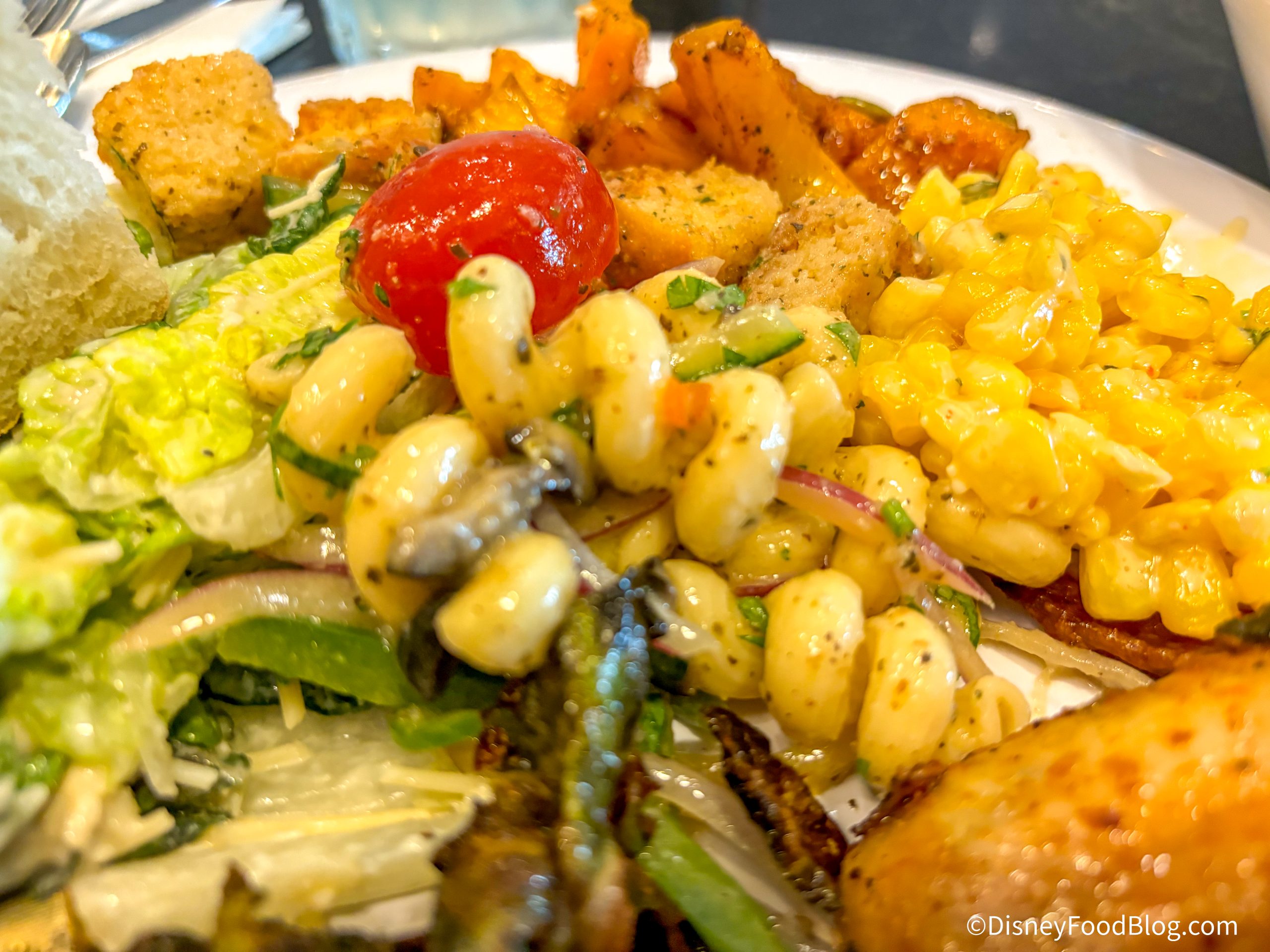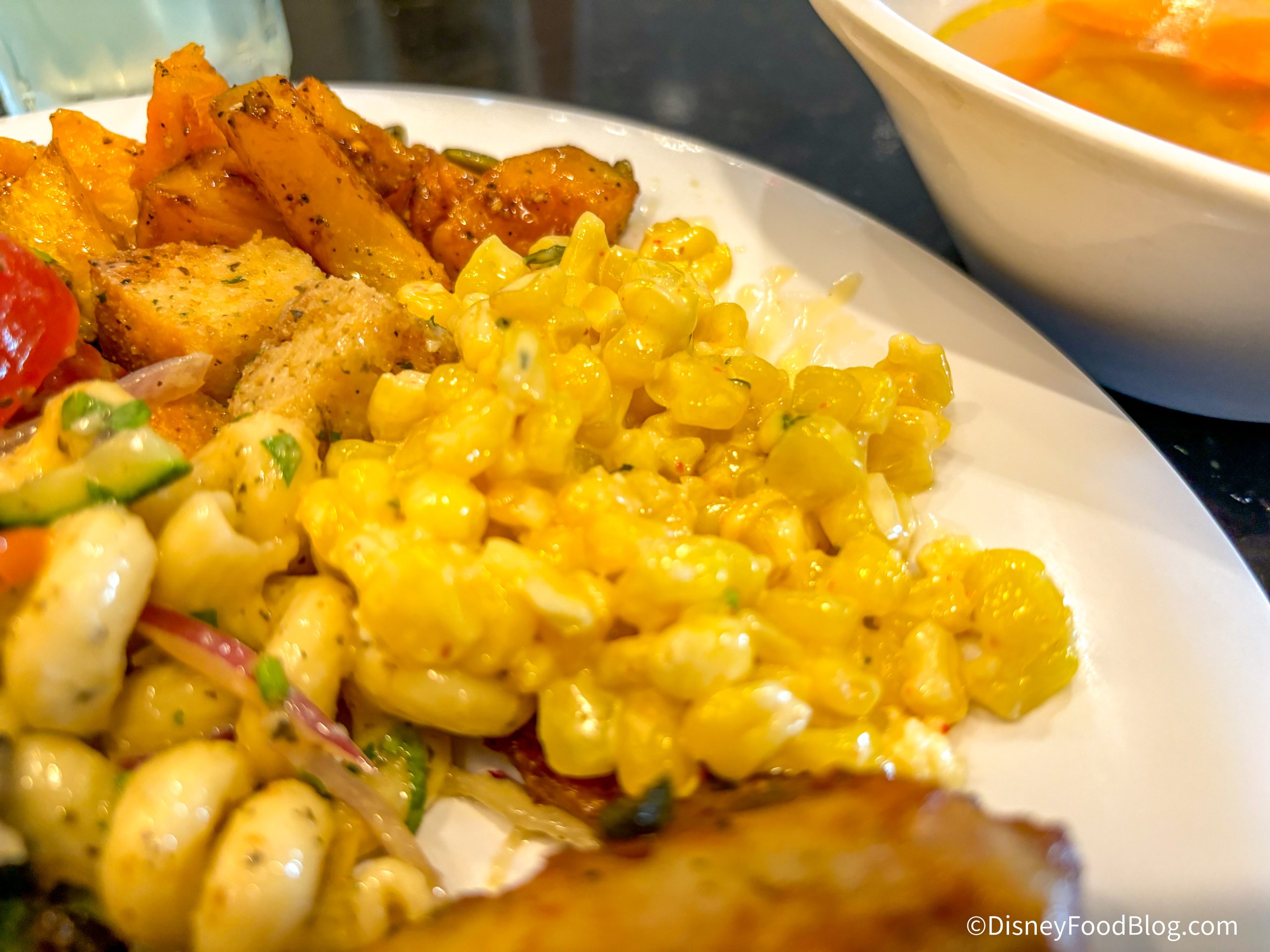 Overall, the food was good, but we didn’t really eat anything that really knocked our socks off. We think there is a great variety and pretty much anyone would be able to find something they wanted. We were disappointed in a few of the dishes (Chicken Noodle Soup, Pasta Salad, Poulet Marine Au Four and the Bread Pudding), but most dishes we really enjoyed. Our favorites included the Mexican Street Corn, Herbed Focaccia, and Blueberry-Lemon Tart.
