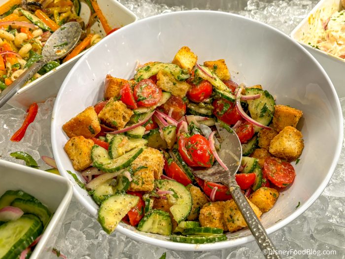 There is also a panzanella salad, with crusty bread, tomatoes, red onions, and cucumbers.