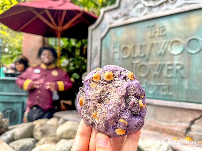 We are pretty sure this cookie was ACTUALLY a ghost. Even while trying to take pictures we couldn’t get our camera to focus on it — SPOOKY! The Terror Cookie (aka the ghost cookie) has white chocolate chips, Oreo bits, and a dusting of cinnamon sugar on top. The cookie itself is a regular sugar cookie dyed purple — definitely deserving to be the official Tower of Terror cookie.