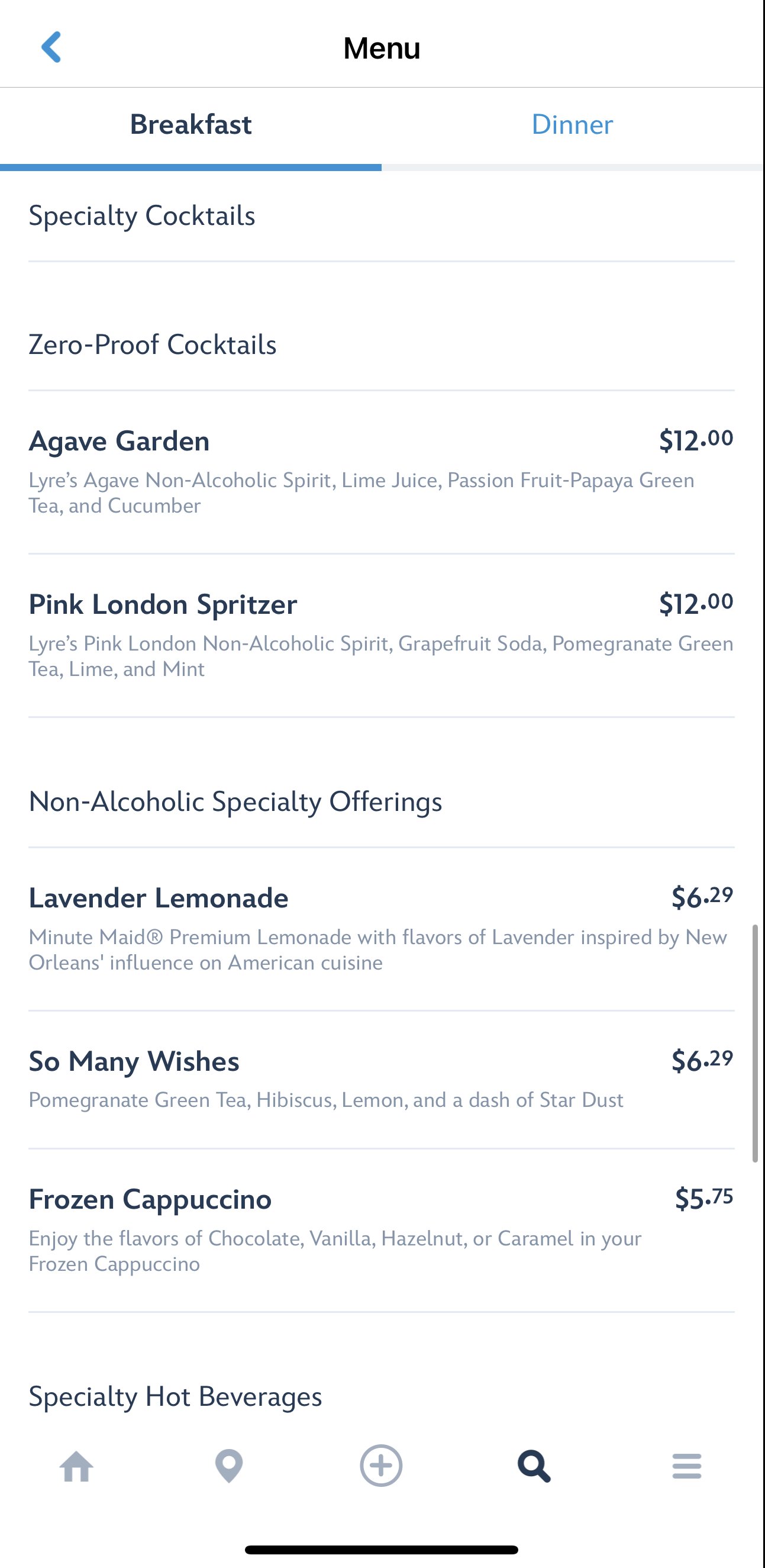 The Lavender Lemonade was $6.29 and is Minute MaidĀ® Premium Lemonade with flavors of Lavender inspired by New Orleansā influence on American cuisine. This was WAY more lavender than lemonade to us ā weāre not sure if it was just the mocktail we got, but the lavender syrup was much stronger than the lemonade. It was floral and tart but not in the best way!