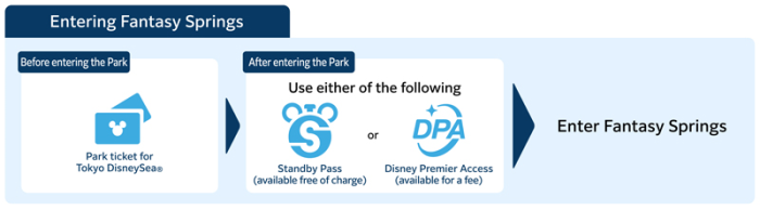 To get a Standby Pass or Disney Premier Access pass, you will need a park ticket for Tokyo DisneySea. Then you will reserve your time for the attraction on the Tokyo Disney Resort app. The “1-Day Passport: Fantasy Springs Magic” includes a ticket to Tokyo DisneySea with the ability to experience Fantasy Springs at any point in the day.