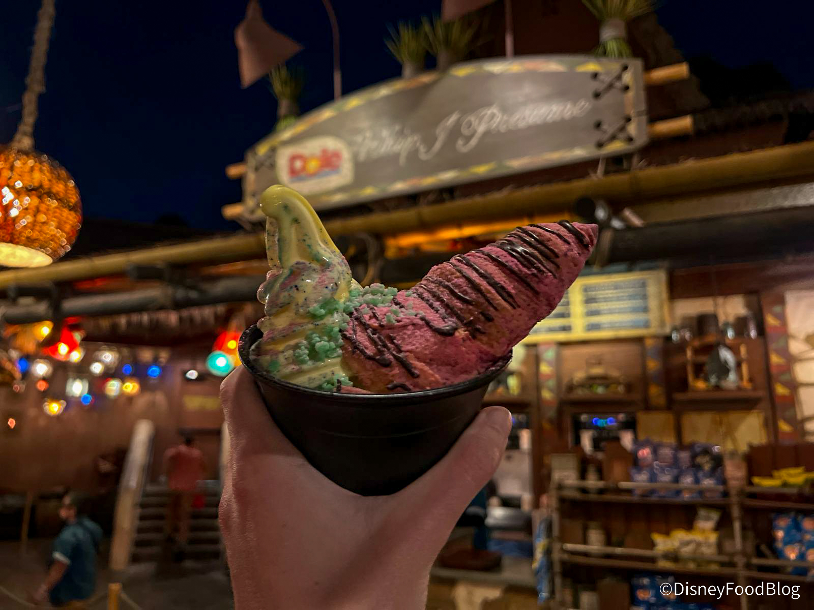 The prominent flavors in this sundae were the Pineapple Dole Whip and ube flavor. The ube was present but not overbearing. It was a fun snack, but it didn’t blow us away. However, if you like Dole Whip, this could be a great option!