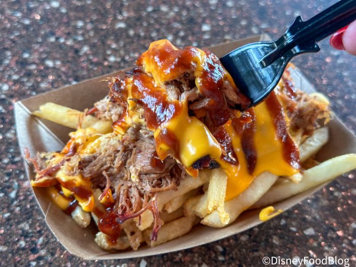 Let’s talk about the French Fries with Pulled Pork and Cheese that is drizzled with barbecue sauce!