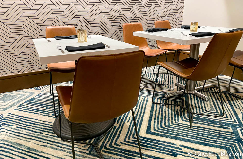 In the dining room, the seating definitely follows that mid-century modern feel. There are geometric patterns on the walls and carpets, and the tables and chairs are sleek and understated.