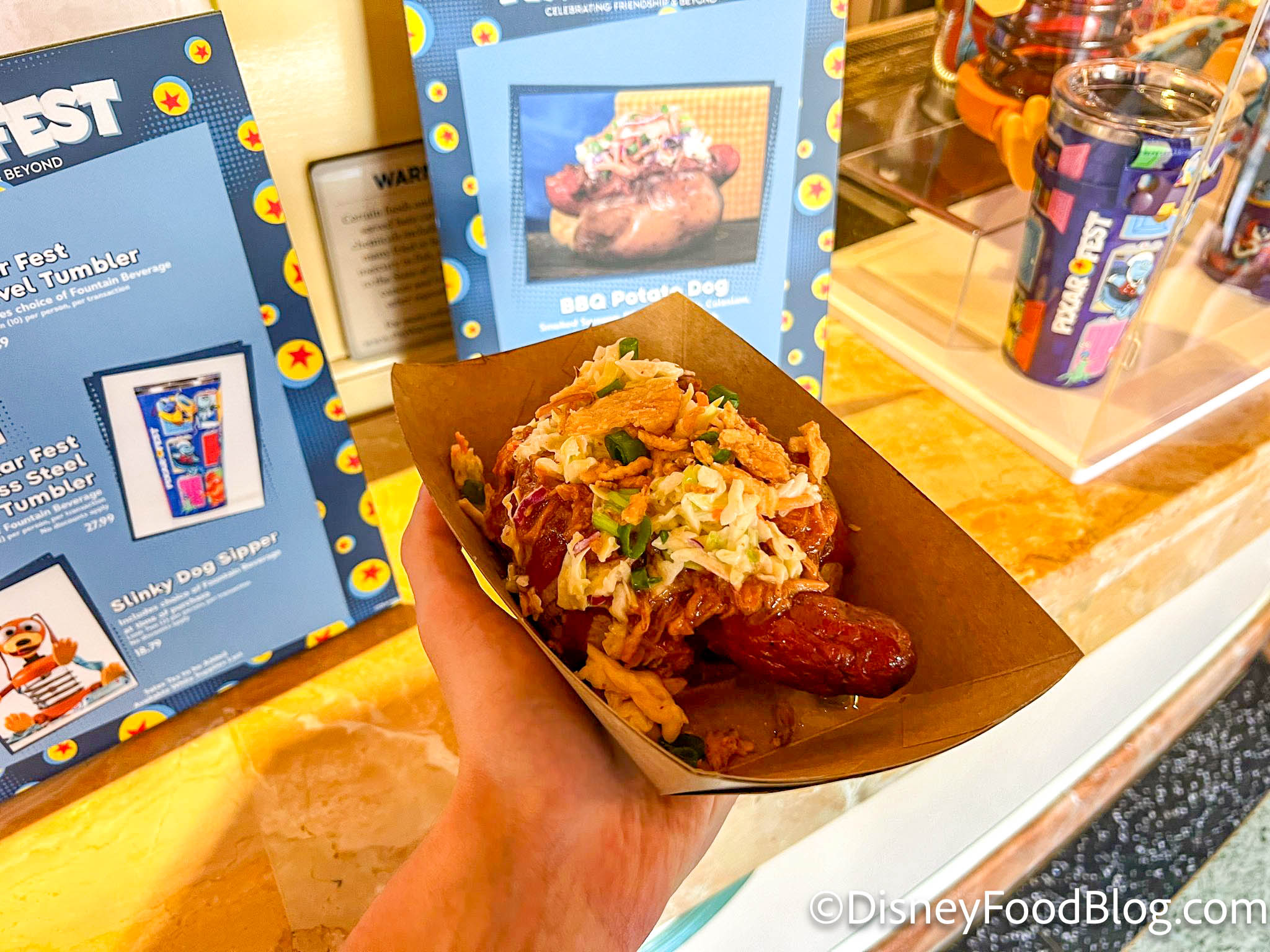 Next up, we’re heading to Refreshment Corner for a Toy Story-themed snack — the BBQ Potato Dog. This dish features smoked sausage, BBQ pulled pork, coleslaw, fried onions, and green onions served in a baked potato.