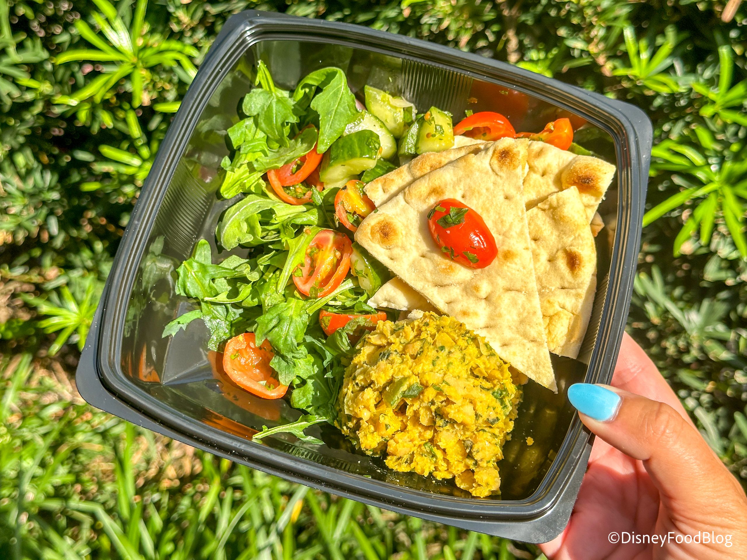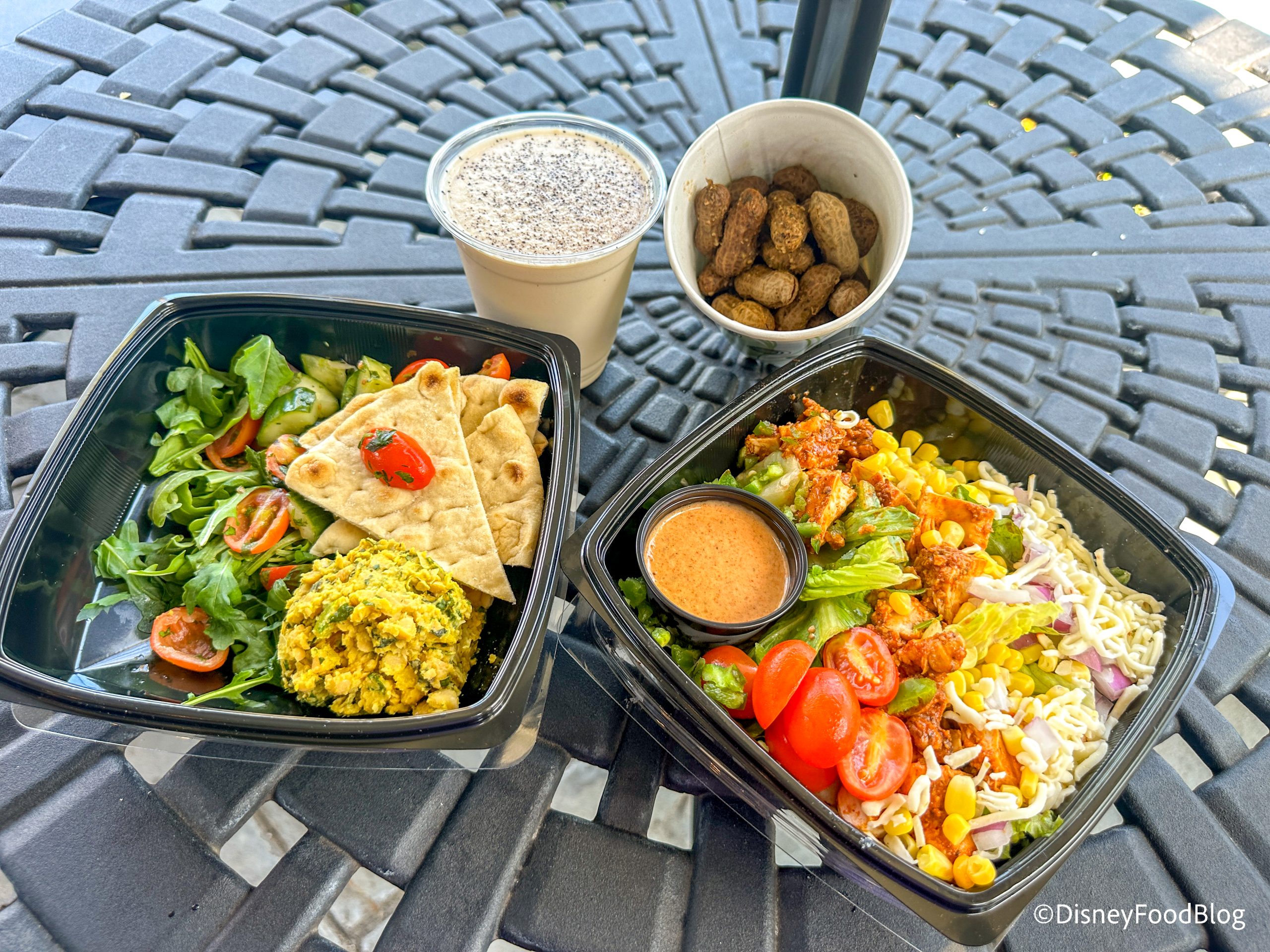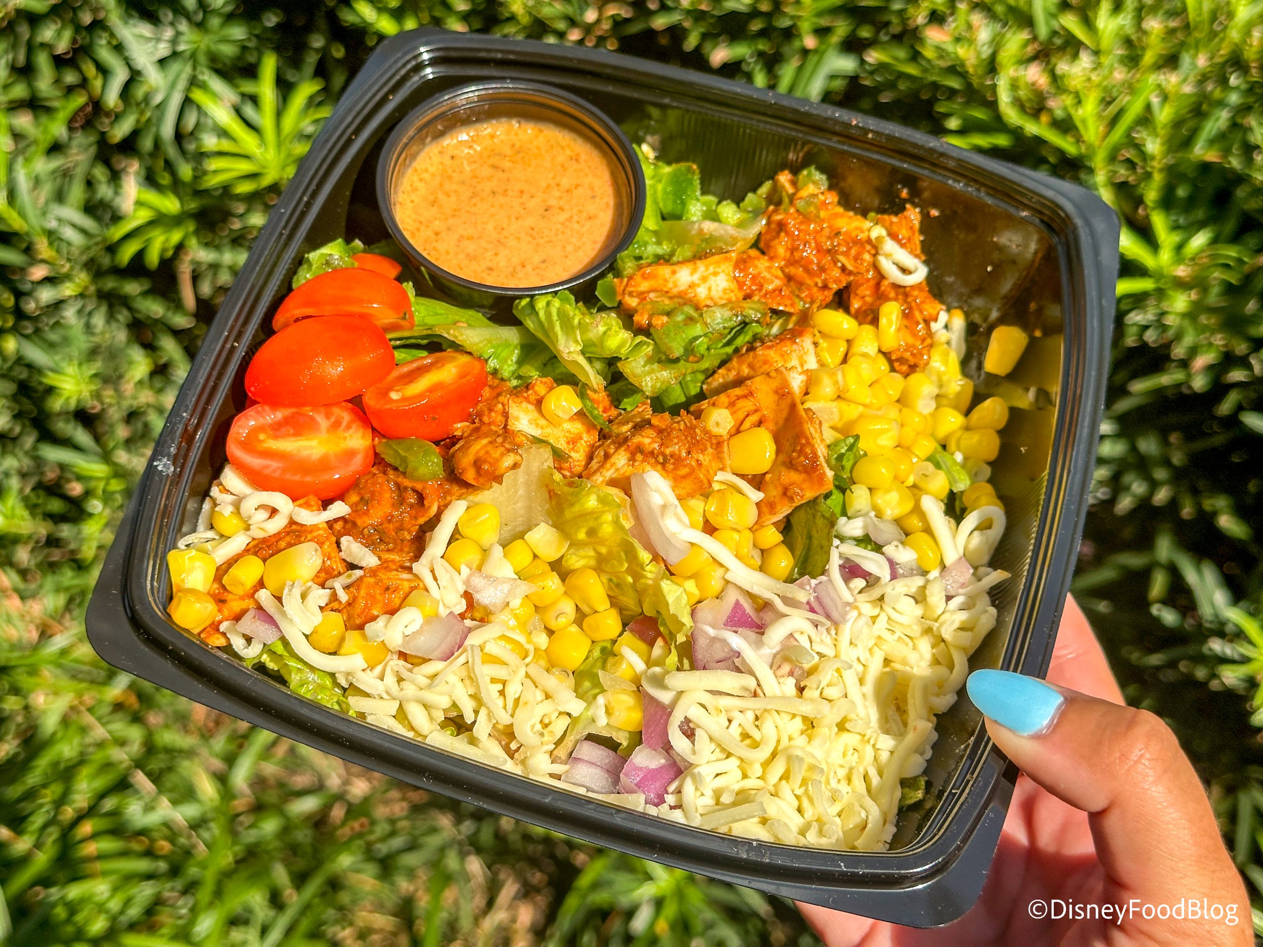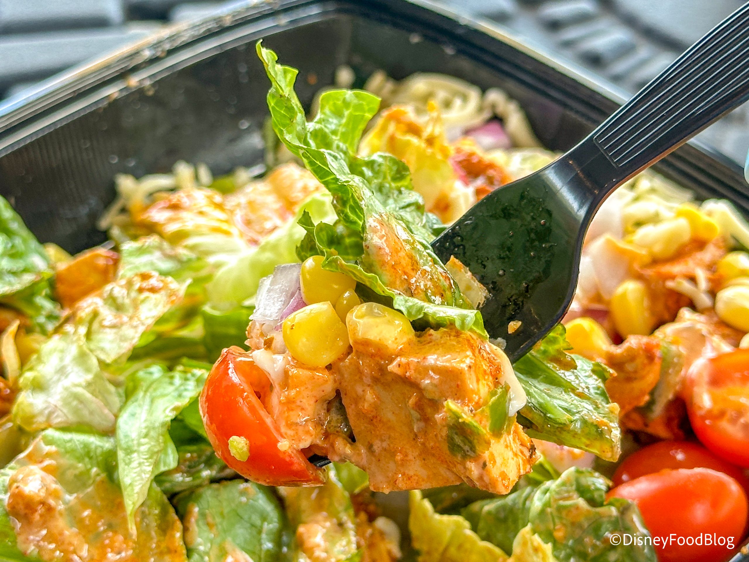 We got two different salads, and this was our favorite of the two. We appreciated that the lettuce was not as wet as it is usually in Disney World salads. We loved the combination of cheese, onions, corn, and the seasoning. It all worked really well together and made for a tasty salad.