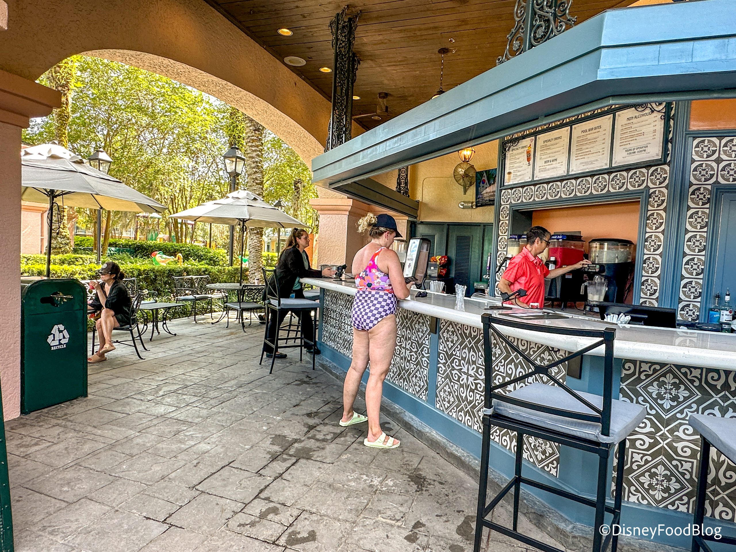 That’s right, we are headed to Port Orleans Resort — French Quarter, and our mission is not beignets. Instead, we are checking out a different dining option: the pool bar. Port Orleans Resort — French Quarter pays tribute to New Orleans. The resort is full of Mardi Gras spirit every day of the year! We are headed over to the Mardi Gras-themed pool, Doubloon Lagoon, to see what eats and drinks this resort has to offer poolside.