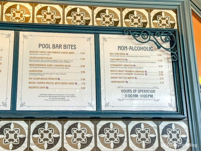 We were impressed with the selection of food and drinks for a pool bar. There were a variety of pool bites, and we loved that they were light and healthy, so we didn’t feel bogged down. The food was all tasty, but nothing incredibly special. If you are looking for a hearty meal while at Port Orleans, this would not be you best option. It is perfect for a drink and a light bite while you are enjoying the pool or walking around the resort. However, Port Orleans Resort — French Quarter has a lot of other tasty options including Scat Cat’s Club and Sassagoula Floatworks and Food Factory. We wish there was a bit more Cajun kick to the food options, but we still thought they tasted fresh and delicious!