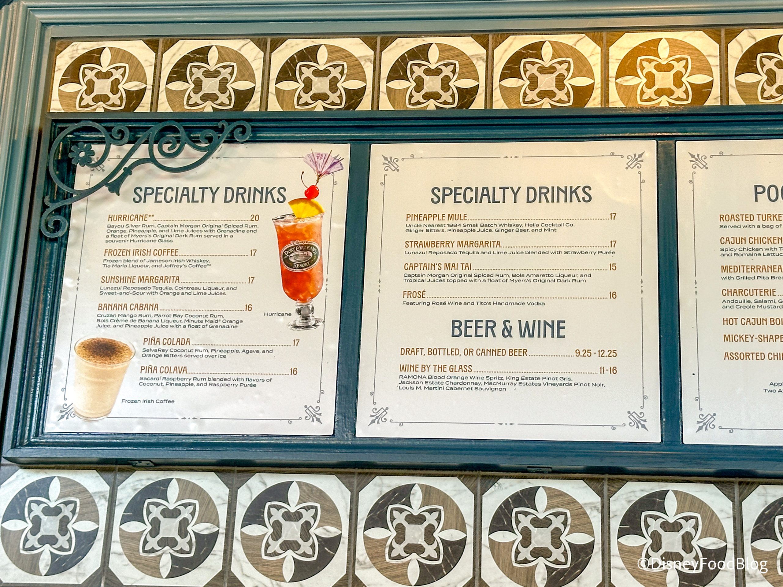 Here is a closer look at the alcoholic drink options. There is a large variety of specialty drinks, and you can also get beer and wine. There are lots of classic tropical drinks like a Piña Colada, Mai Tai, Margarita, and Hurricane.