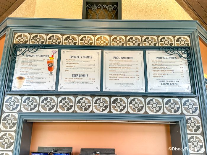 Before we get to the food and drinks, let’s take a quick look at the Mardi Grogs menu! It is fairly small, but it has a lot of good options for a pool bar. You can choose from a variety of specialty drinks and non-alcoholic drinks. There is also a small menu of pool bites you can dine on.