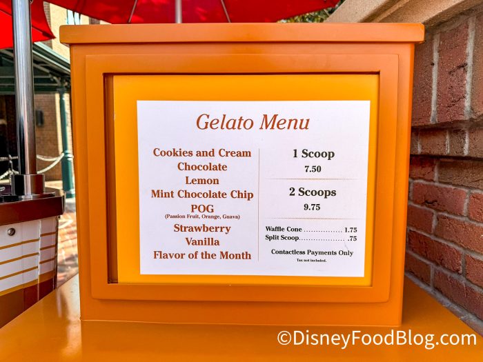 One scoop of any gelato at this cart is $7.50 and two is $9.75. You can split a scoop for an additional $0.75 and get it in a waffle cone for an additional $1.75.