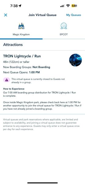 If the virtual queue has filled up, you’ll see a notification alerting you to this change. The app may also note when the next virtual queue will open.